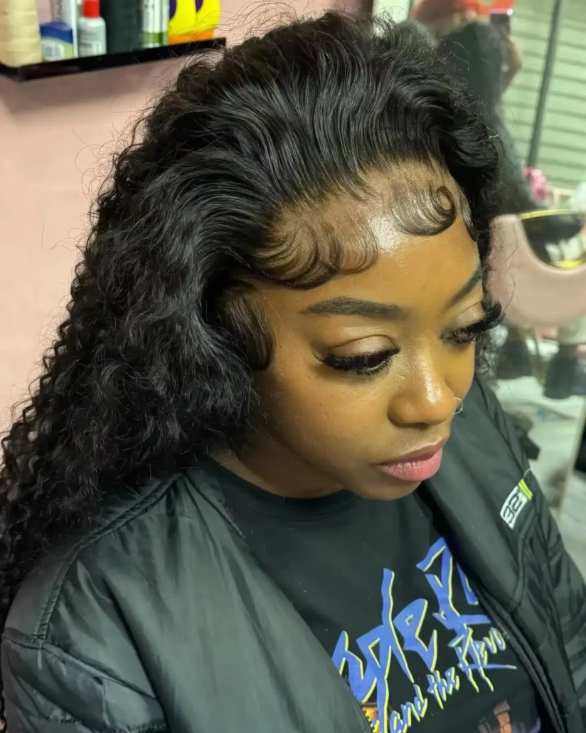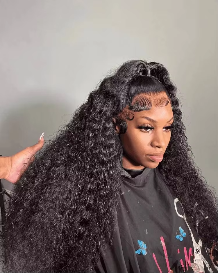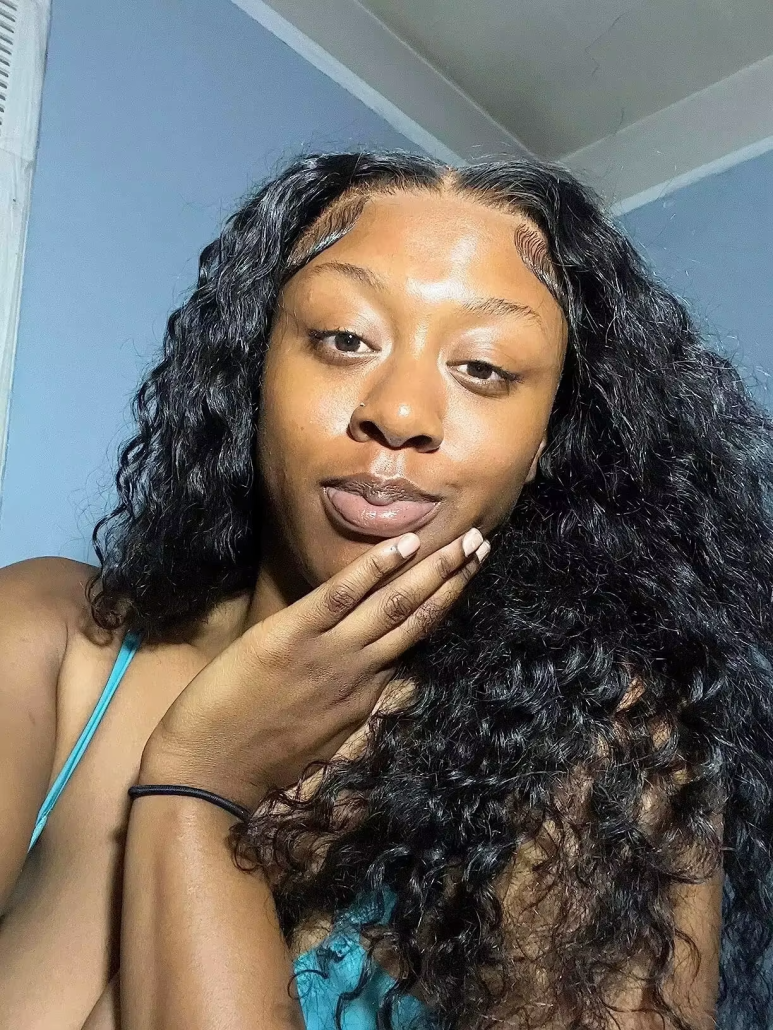 This is a full-frontal water wave wig which means it can be partitioned from any side and held up into a ponytail. If you also love having natural looking baby hairs, this is the perfect wig as the lace runs from ear to ear